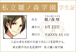 雛ノ森学園の校章と学生証(笑)フリー素材とフリーフォントを組み合わせただけですが、それっぽくなりました。以前学園内にオマケページ作りましたが、もうちょっと内容が増えたらちゃんとオマケもコンテンツとして公開しようと思います。その時学生証と校章もサイト内で公開する予定です。学園の見取り図とか、活動するのには不要な情報ばかりを載せていく予定です(笑)見なくても問題ないけど、暇なときに見たら面白いかも?みたいなコンテンツを目指して。